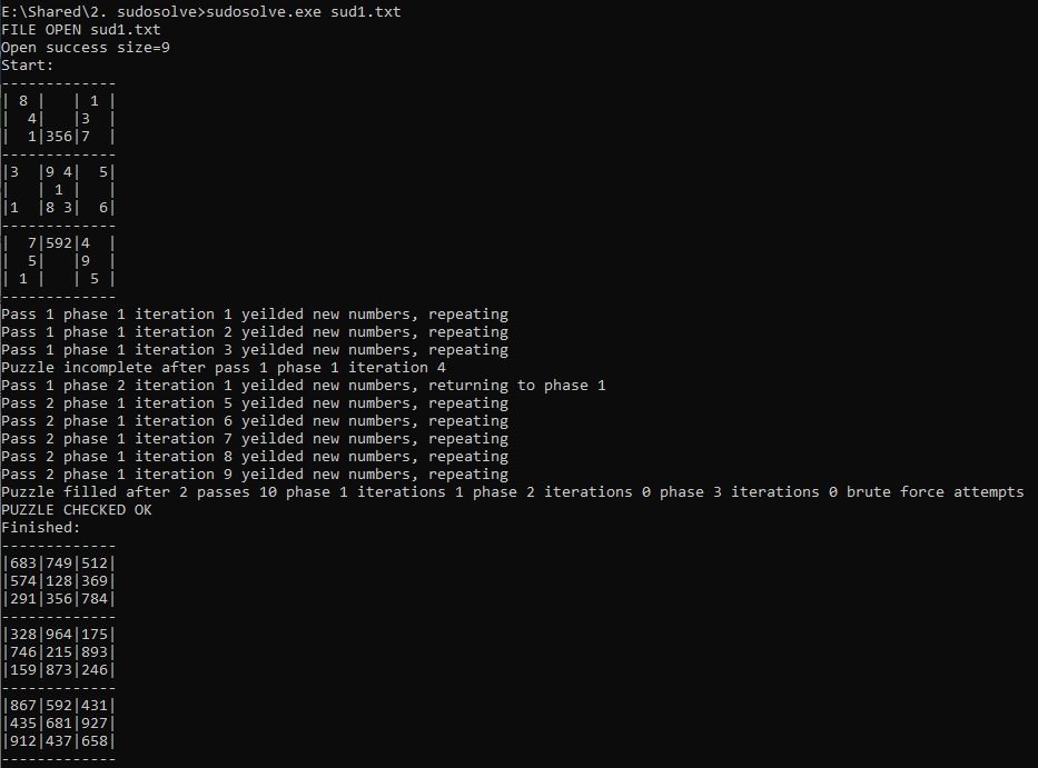 Written in pure C on a little netbook while I was on holiday in Spain. The command line program takes a text file input for the source puzzle and output the a solved puzzle with support for various puzzle sizes.