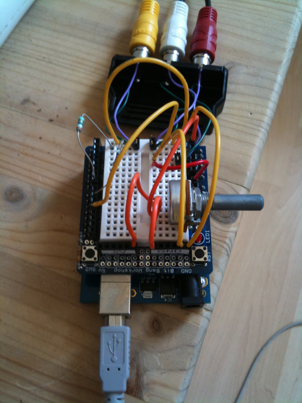This project used most of the limited power of the Arduino to generate the hsync and vsync signals used to create a low resolution video output. Any remaining power from the 8 bit microprocessor was used to run a simple scrolling shooter game with input from a variable resistor and one of the built in buttons.
